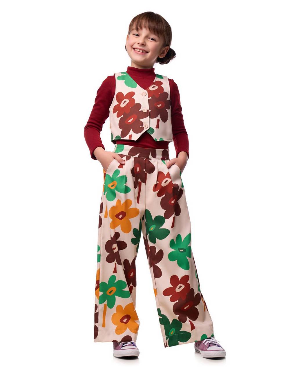 Descrição: Conjunto em sarja leve, pensado para unir conforto, liberdade de movimento e informação de moda. A calça pantacourt possui cós frontal com pregas que garantem um caimento bonito e atual, além de bolsos faca funcionais nas laterais. O ajuste é feito por elástico posterior, proporcionando conforto ao vestir e adaptação ao corpo ao longo do dia. O colete completa o conjunto com abotoamento frontal e modelagem que equilibra estrutura e leveza, criando um visual contemporâneo e cheio de personalidade. A grande protagonista é a estampa floral em formas orgânicas e coloridas, que dialoga com as tendências da estação e traduz a narrativa da coleção Flor do Dia. Flores que surgem como pequenas alegrias do cotidiano, reforçando a importância de desacelerar, cuidar da saúde mental e valorizar os gestos simples que fazem diferença.