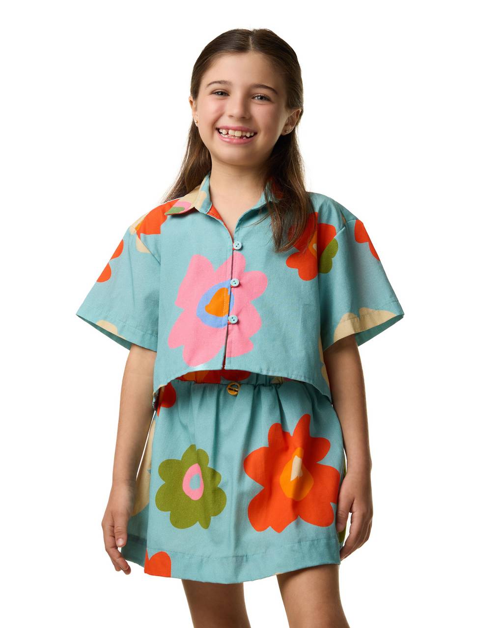 Descrição: Puro conforto e encanto! Esse conjuntinho em tecido leve e fresquinho é perfeito para os dias mais quentes do verão. A saia vem com um shortinho embutido por baixo, garantindo liberdade para brincar, e tem elástico por todas a circunferência da cintura, proporcionando um ajuste confortável. A blusa complementa o visual com sua modelagem soltinha, abotoamento frontal e mangas delicadas, além de um lindo recorte nas costas que traz um toque especial ao look.