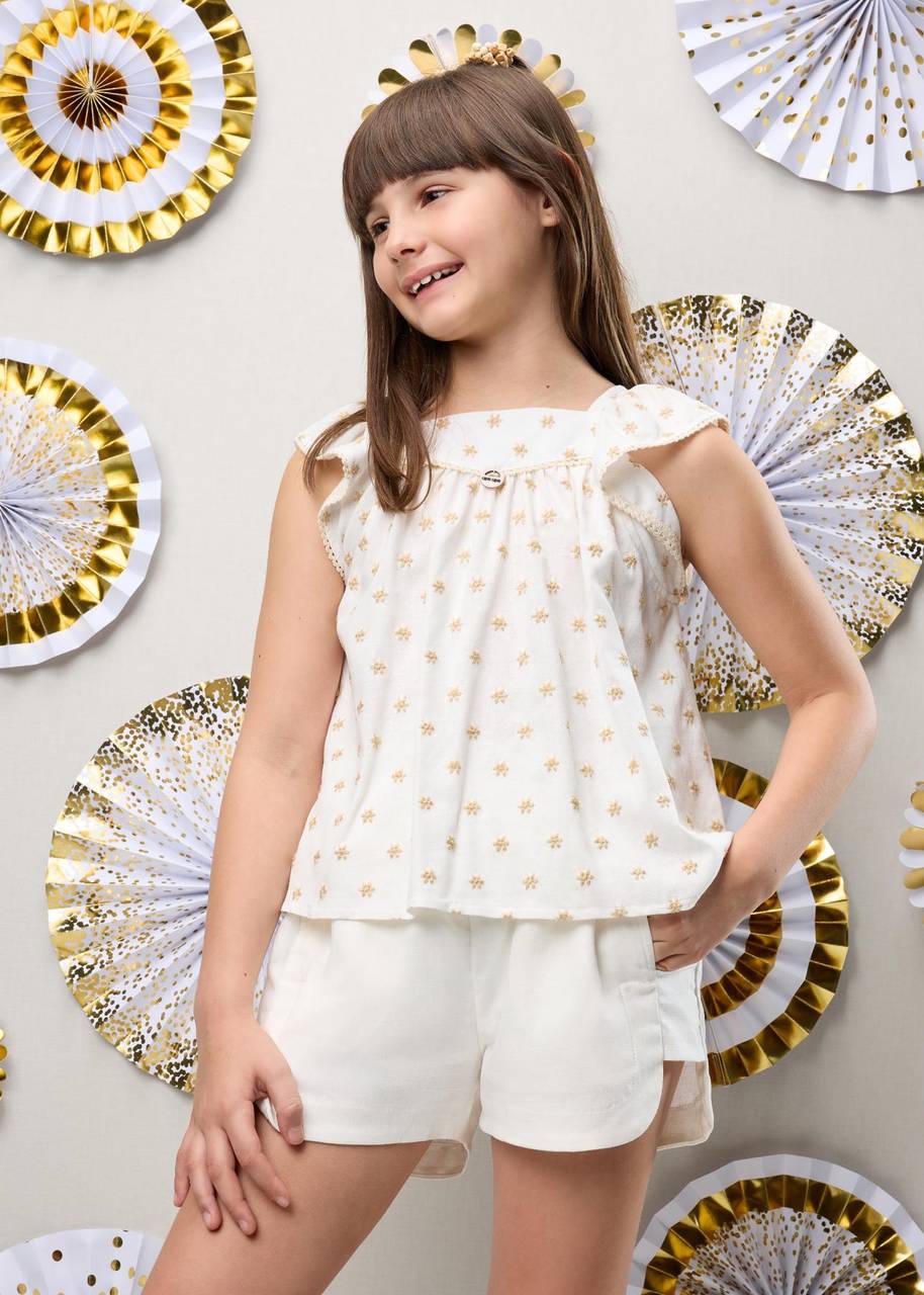 Descrição: Conjunto com bata em tecido todo bordado, de modelagem soltinha e confortável. O recorte no peito valoriza o caimento, enquanto as manguinhas esvoaçantes e a abertura em gota nas costas, com amarração delicada, trazem movimento e charme. O shorts, em tecido liso off white, tem modelagem leve com elástico em toda a cintura, recortes laterais e bolsos que garantem praticidade e liberdade para brincar.