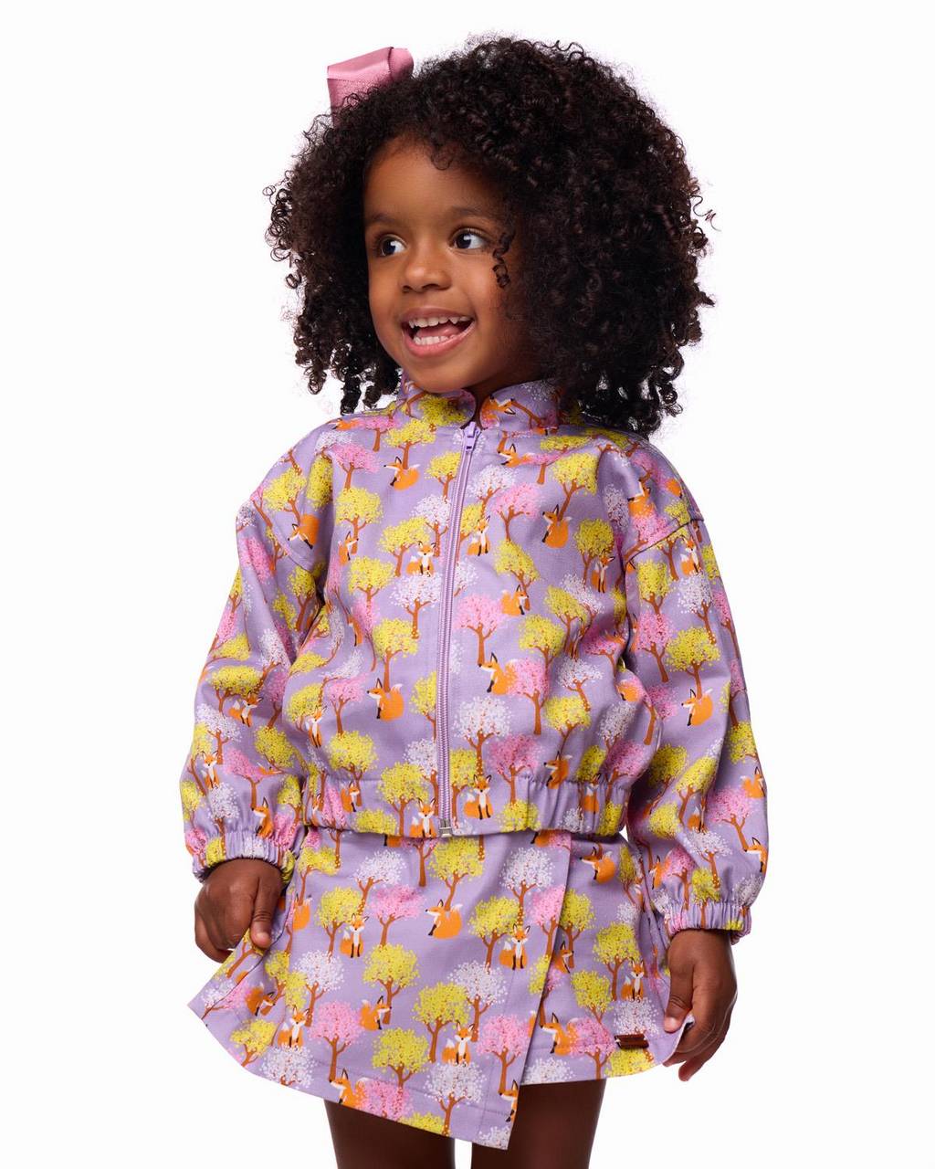 Descrição: Conjunto em sarja estampada que combina conforto e estilo em uma proposta moderna e encantadora. A jaqueta com modelagem bomber traz elástico nos punhos e na barra, garantindo um caimento ajustado e confortável, além de fechamento por zíper frontal que facilita o vestir. A golinha padre adiciona um toque contemporâneo à peça. O short saia complementa o look com um recorte frontal que traz movimento e charme, além de elástico na parte posterior que proporciona melhor ajuste ao corpo. O grande destaque fica por conta da estampa delicada de raposinhas entre ipês floridos, criando um cenário lúdico e cheio de poesia.