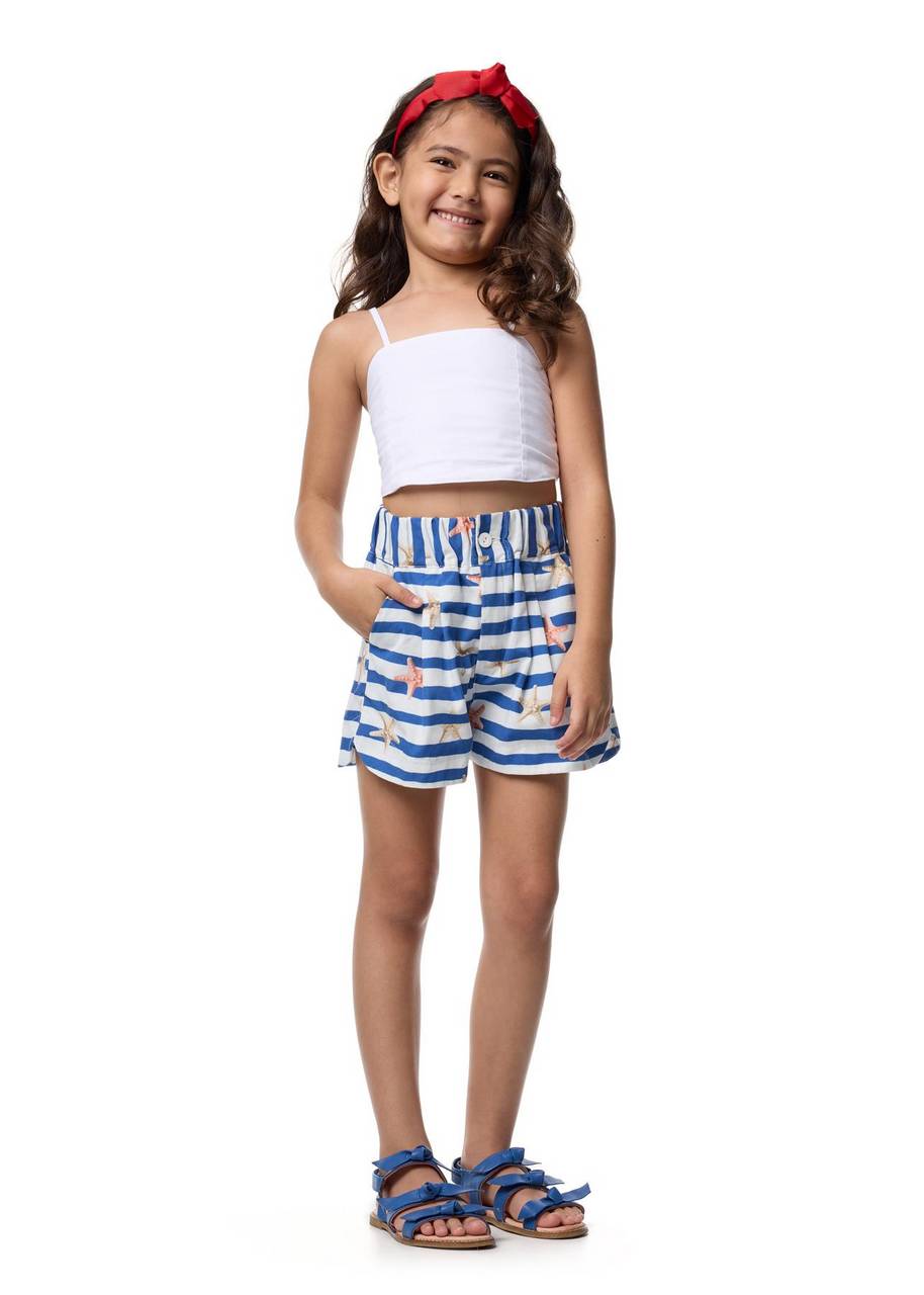 Descrição: Conjunto fresco e descomplicado, perfeito para os dias de sol. O short tem modelagem soltinha com cintura ajustada por elástico, pregas frontais, bolsos faca nas laterais e fechamento por zíper e botão, garantindo conforto com um toque de estilo. A estampa em listras azuis com estrelas do mar traz leveza e um clima praiano irresistível. O top branco é delicado e funcional, com recortes frontais, alcinhas finas reguláveis e costas com elástico embutido para um ajuste confortável e seguro.