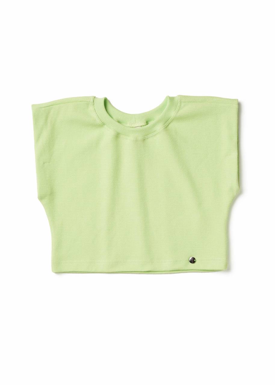 Descrição: Top cropped em malha texturizada de alta qualidade, com toque suave e caimento leve. Sua modelagem soltinha traz conforto e liberdade aos movimentos, enquanto as manguinhas com barra na galoneira e o punho no decote garantem acabamento moderno e cheio de estilo. O design minimalista e a cor fresca deixam a peça perfeita para compor produções alegres e cheias de personalidade.