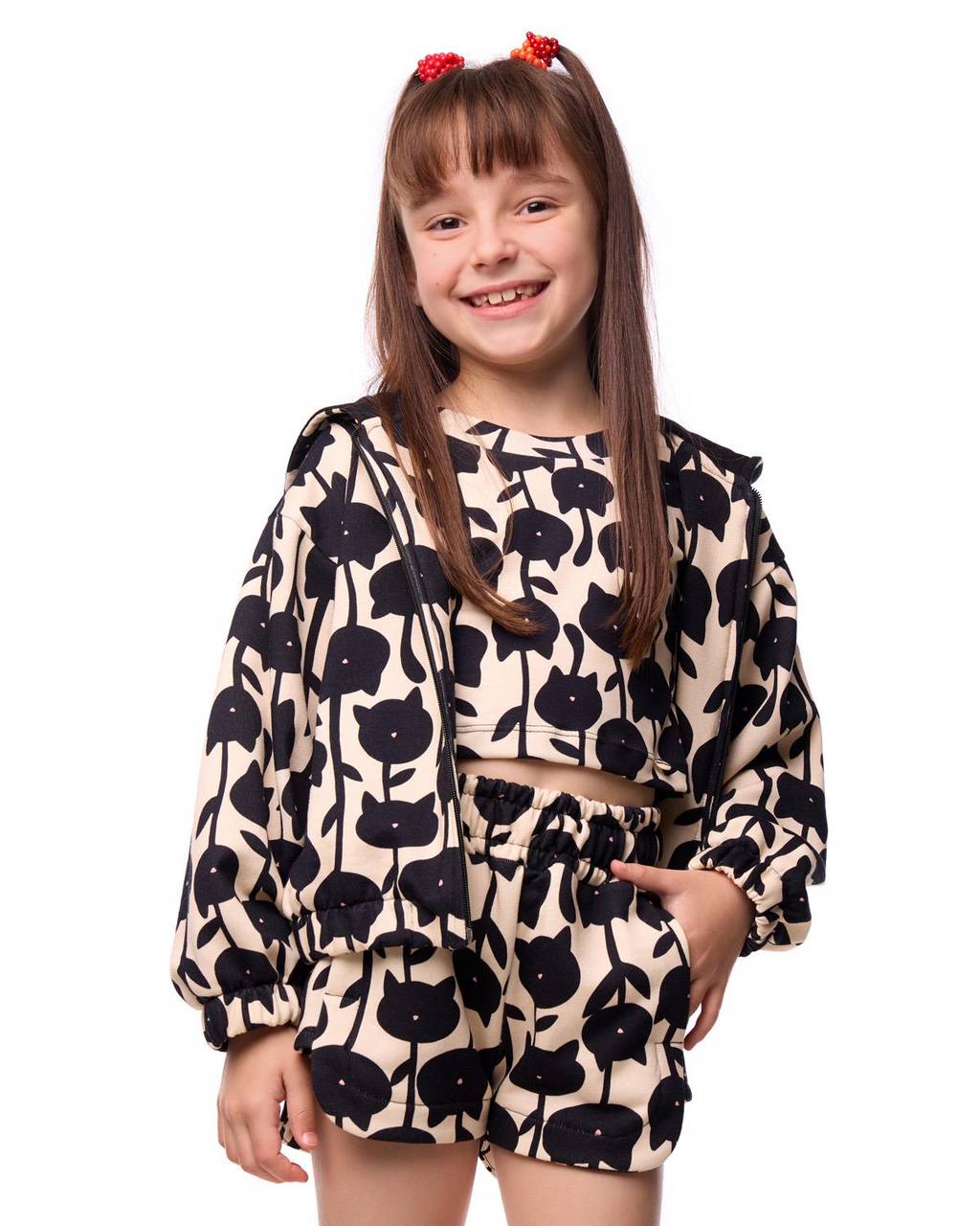 Descrição: Conjunto em moletom macio que une conforto e informação de moda em uma proposta lúdica e cheia de personalidade. A jaqueta estilo bomber possui elástico nos punhos e na barra, além de fechamento frontal por zíper e capuz forrado em malha 100% algodão, trazendo aconchego e praticidade para o dia a dia. O shorts acompanha a mesma base de moletom, com caimento soltinho, cós com elástico em toda a circunferência, recortes estratégicos e bolsos faca laterais que garantem funcionalidade sem perder o charme. O top em malha suedine 100% algodão completa o conjunto com um toque suave e delicado sobre a pele. O grande destaque fica por conta da estampa “pé de gato”, que brinca com a imaginação ao transformar folhagens em pequenas carinhas de gatinhos, como se fossem uma plantinha encantada crescendo ao longo da peça.