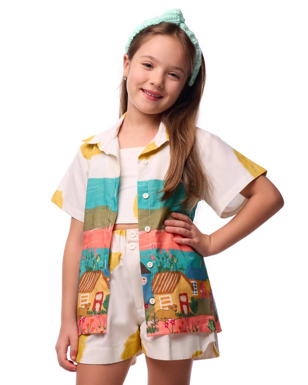 Descrição: O kit infantil Vila dos Caramelos combina versatilidade e conforto em uma proposta leve e atemporal. Composto por camisa ampla de modelagem soltinha, short confortável e top ajustado ao corpo, ele foi pensado para acompanhar diferentes momentos do dia, inclusive como saída de praia. A camisa tem caimento solto, o short possui pregas frontais, bolsinho faca funcional, fechamento por zíper e botões na frente e elástico em toda a cintura, enquanto o top conta com elástico nas costas e alcinhas reguláveis. A estampa localizada Vila dos Caramelos tem o cachorro caramelo como protagonista, percorrendo uma pequena vila desenhada à mão, com casinhas e paisagens coloridas que remetem ao imaginário infantil. O short e o top em poá equilibram a composição com leveza e identidade.
