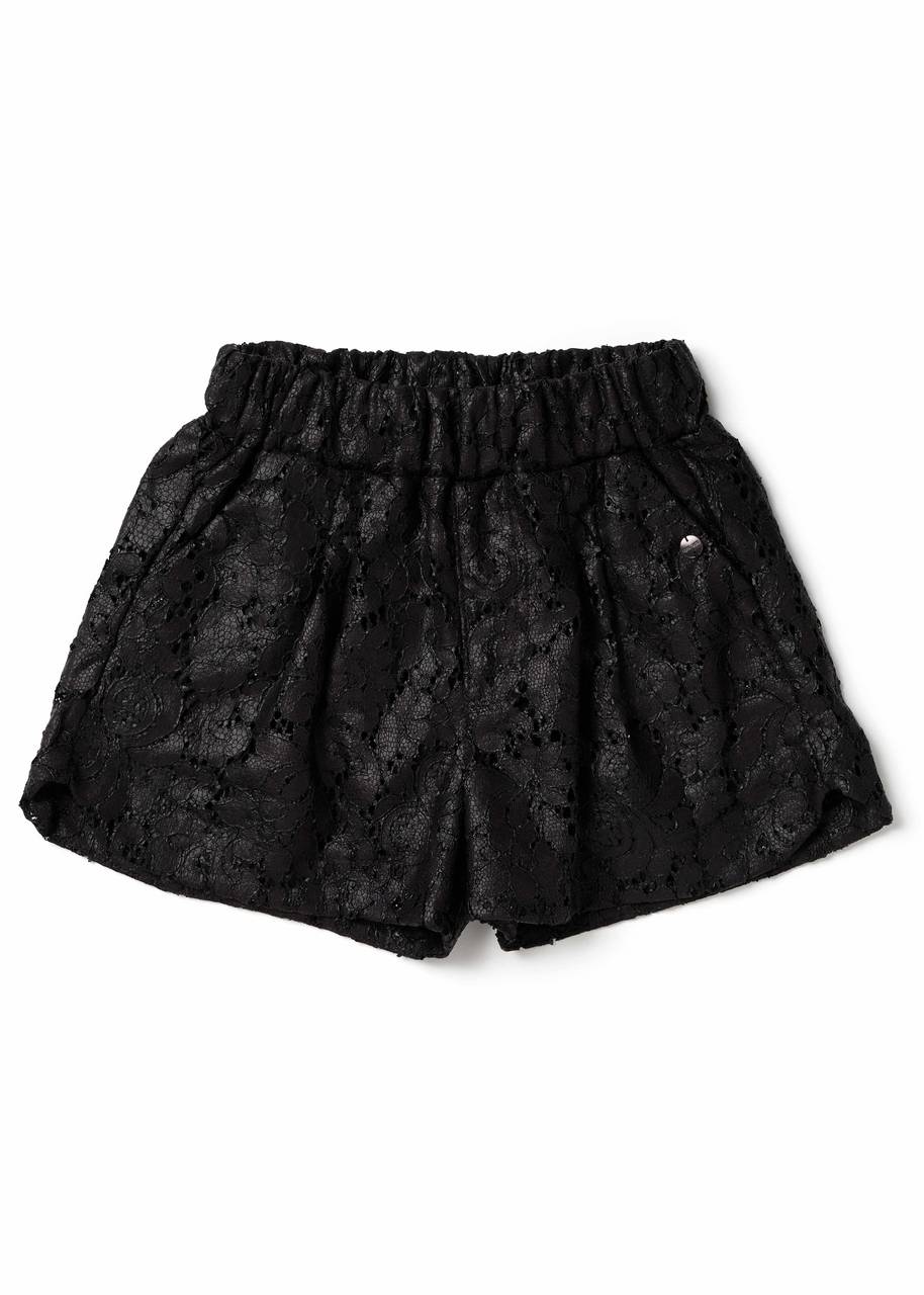 Descrição: O shorts é feito em tecido rendado com leve brilho, que deixa a peça encantadora e divertida. Tem barra aplicada por dentro, bolsinho faca nas laterais, pregas na frente e elástico em toda a cintura, garantindo conforto para brincar à vontade. Sugestão de uso: combina com blusinhas leves e sandálias coloridas para um dia cheio de descobertas e brincadeiras.