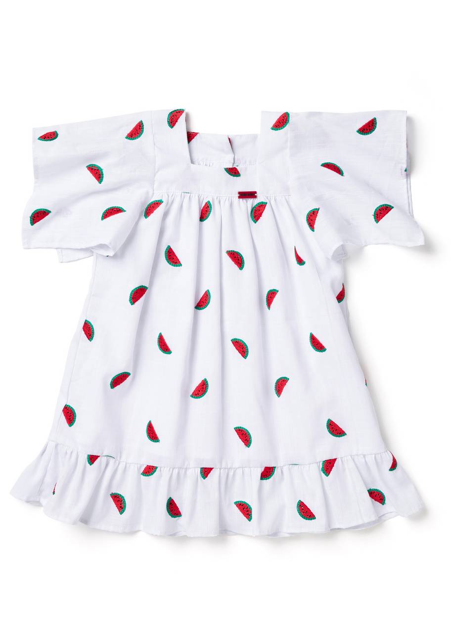 Descrição: Vestido em tecido de algodão leve e fresco, todo bordado com pequenas melancias que trazem um toque divertido e lúdico. A modelagem soltinha e o babado na barra dão leveza aos movimentos, enquanto o decote quadrado e as manguinhas amplas garantem um charme atemporal. Fechamento posterior por botões, pensado para vestir com facilidade e conforto.