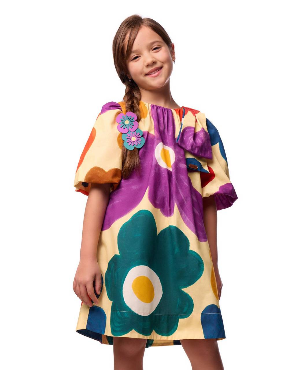 Descrição: Um clássico da Camu Camu, o vestido infantil em A é uma daquelas peças que atravessam coleções e continuam encantando. Com modelagem soltinha, ele veste bem diferentes tipos de corpo, garantindo conforto, liberdade de movimento e um caimento leve. As mangas balonê acrescentam volume delicado, enquanto o maxi laço no ombro surge como detalhe especial que transforma a peça e imprime personalidade ao visual. A estampa é a grande protagonista. O maxi floral aparece em cores intensas e formas amplas, como se tivesse sido desenhado à mão, criando uma composição artística, expressiva e cheia de vida. Um floral contemporâneo que conversa com o universo infantil de forma lúdica, alegre e atemporal, valorizando o desenho e a cor como narrativa. O vestido conta ainda com abertura e abotoamento posterior, pensados para facilitar o vestir no dia a dia, sem interferir na estética da peça. Uma peça feita para vestir a infância com identidade, conforto e imaginação.