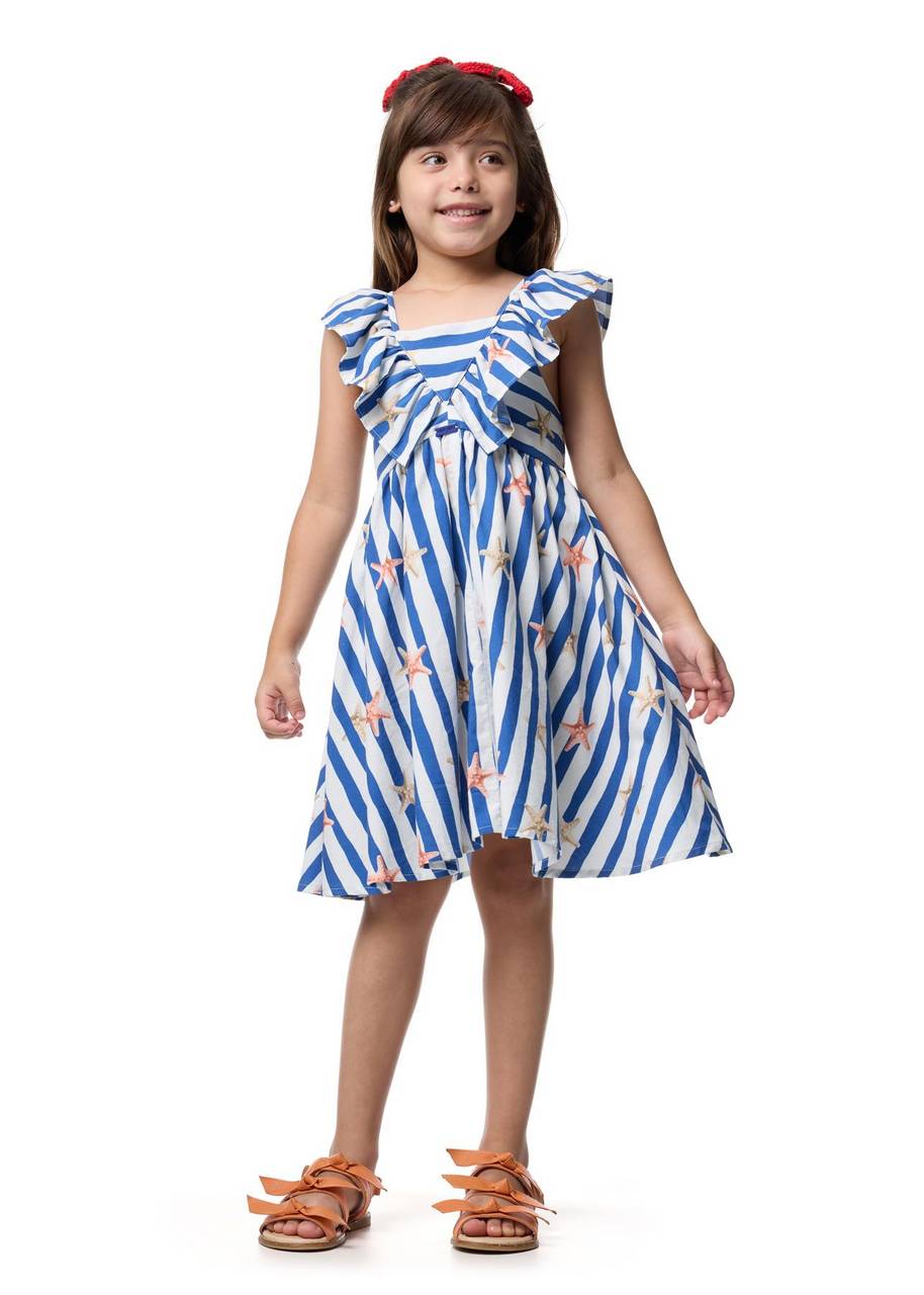 Descrição: Vestido leve e divertido confeccionado em tecido 100% algodão com estampa de listras irregulares em azul e branco, pontuadas por delicadas estrelas-do-mar em tons suaves. A modelagem soltinha tem cintura levemente marcada e saia rodada que garante movimento e conforto. O grande destaque fica para o babado que contorna o decote frontal e segue até as costas em formato de “V”, criando um efeito encantador. O ajuste traseiro é feito por elástico embutido, garantindo vestibilidade e praticidade no dia a dia.
