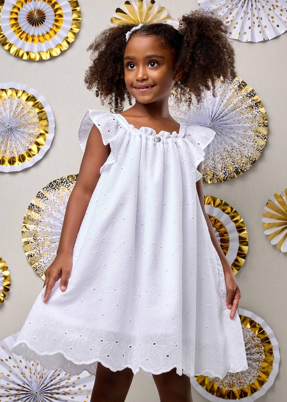 Descrição: Vestido em modelagem ampla, confeccionado em laise bordado de 100% algodão leve e macio, que garante frescor e conforto. O franzido no decote cria movimento delicado, enquanto as manguinhas esvoaçantes dão um ar encantador e alegre. O barrado bordado completa a peça com um detalhe especial, tornando-a ainda mais charmosa.