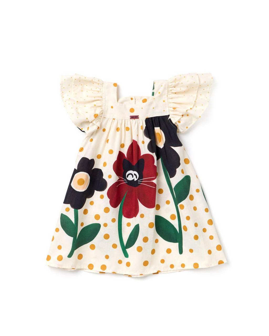 Descrição: Vestido bebê com modelagem soltinha e confortável, decote quadrado e franzido delicado que garante leveza ao vestir. Possui manguinhas com babados duplos, trazendo movimento e charme à peça, além de abertura posterior por botões, facilitando o vestir no dia a dia. O grande destaque é a estampa localizada Jardim de Gato. Entre poás delicados surgem flores deslumbrantes, com miolinhos em forma de gatinho preto, criando um visual lúdico e cheio de personalidade. Um desenho que mistura imaginação e afeto, trazendo para a roupa referências do cotidiano brasileiro e do vínculo das crianças com seus animais de estimação.