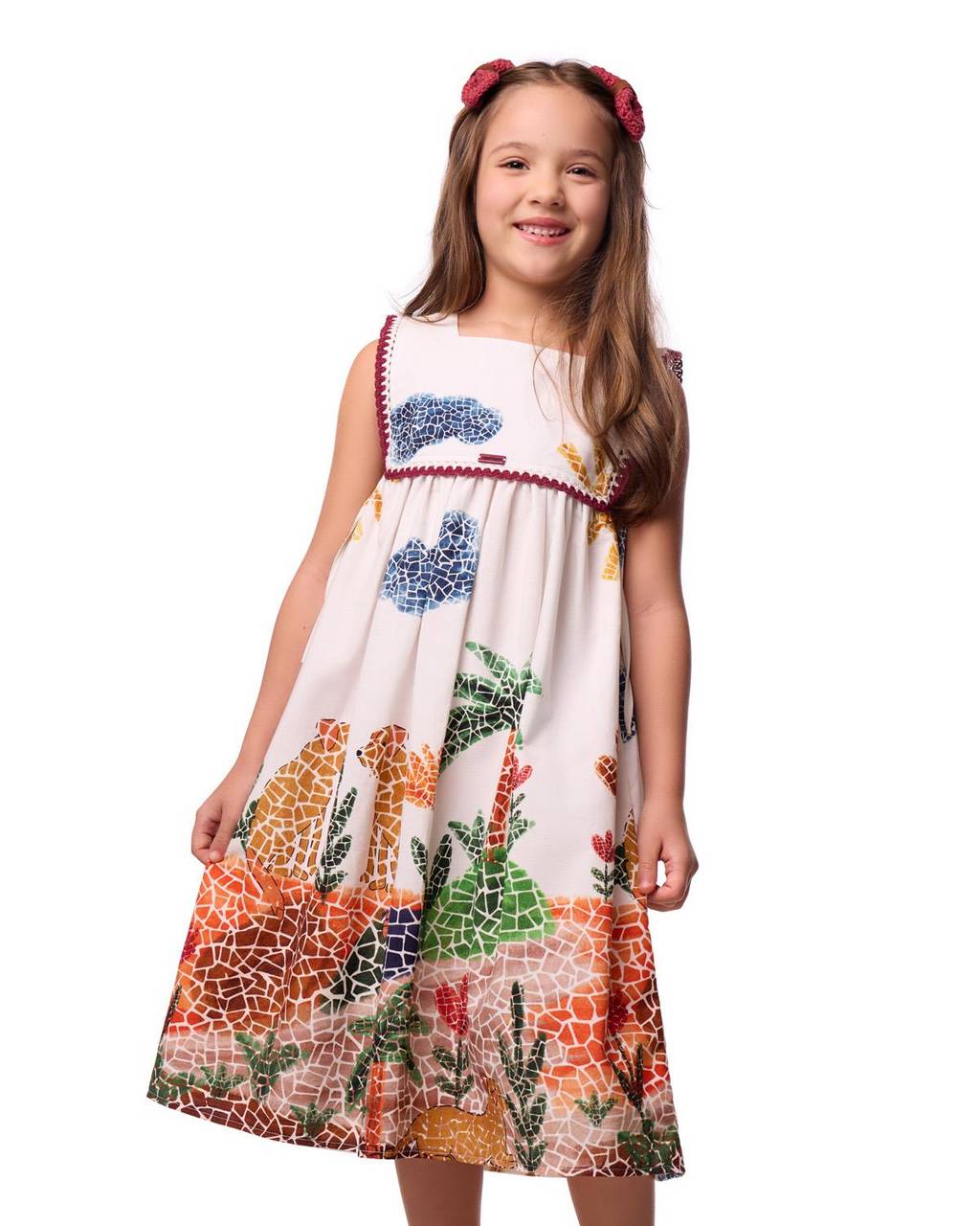 Descrição: O vestido infantil feminino com saia rodada traduz delicadeza com um toque artesanal que faz toda a diferença. O recorte quadrado no peito valoriza o colo de forma clássica e elegante, enquanto o contorno em passamanarias acrescenta textura e riqueza aos detalhes, trazendo um acabamento cuidadosamente elaborado. O abotoamento posterior facilita na hora de vestir e garante praticidade para a rotina. A saia rodada cria movimento fluido e leve, tornando este vestido infantil uma escolha encantadora para momentos especiais e também para o dia a dia. A estampa vibrante de caramelos em mosaico ganha vida entre elementos como sol, nuvens e jardim, compondo um cenário lúdico que celebra a alegria e a brasilidade. Colorida e expressiva, transforma o vestido infantil estampado em uma peça cheia de identidade.