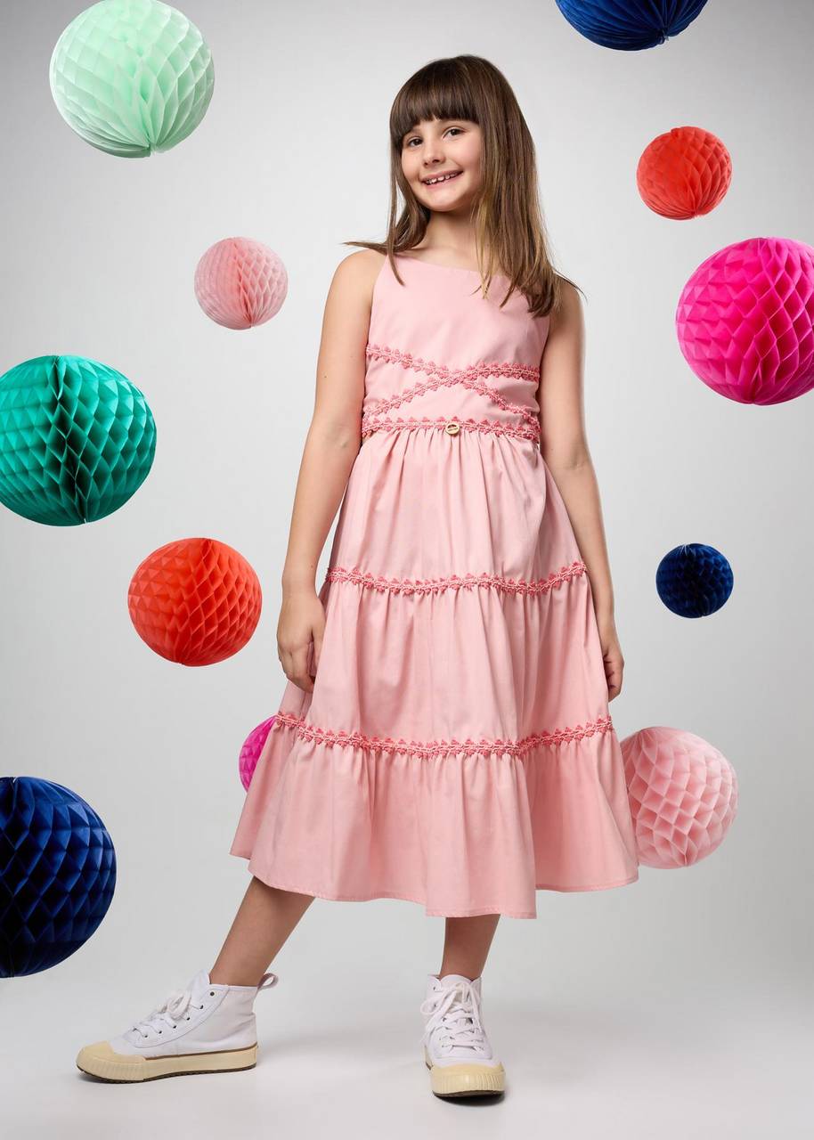 Descrição: Vestido Primavera confeccionado em algodão leve e confortável, com modelagem delicada e cheia de movimento. A saia rodada em três marias traz fluidez, enquanto o corpo ajustado valoriza o caimento. As alcinhas são reguláveis e o ajuste posterior é feito por quatro botões, garantindo praticidade e charme. O vestido vem todo enfeitado com passamanaria bico aplicada, que adiciona um toque artesanal especial. O grande diferencial está no cut out lateral, uma pequena abertura que confere leveza e modernidade à peça.