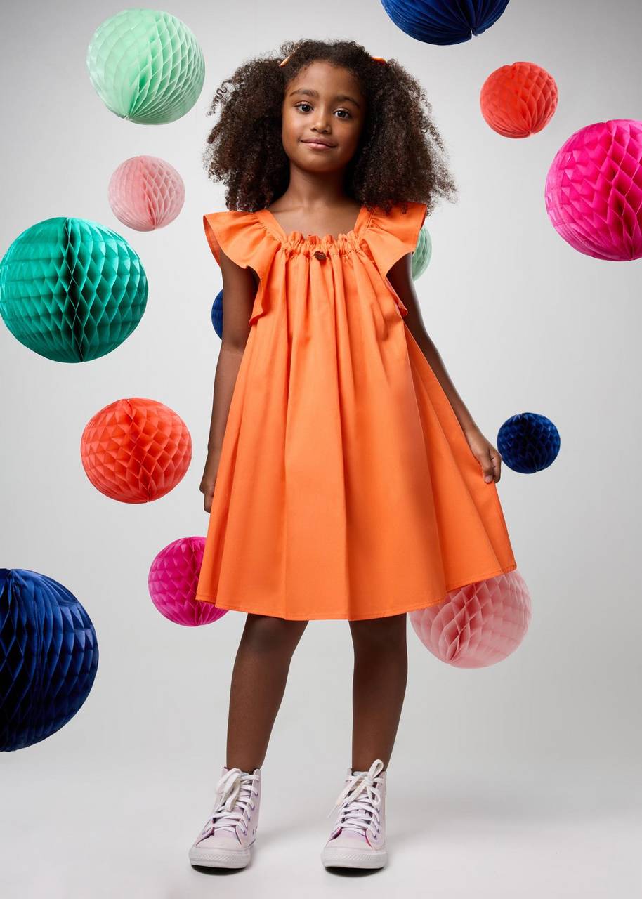 Descrição: Vestido com modelagem ampla e fluida, que traz movimento e conforto em cada detalhe. O decote com cabeção e elástico cria um franzido delicado, formando um caimento soltinho e gracioso. As alças largas com babados dão um toque lúdico e feminino, equilibrando a leveza da peça com um ar de festa e liberdade. O tecido vibrante e cheio de vida torna o visual ainda mais especial, perfeito para dias de alegria e brincadeiras.